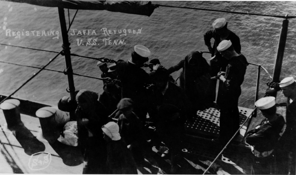 Here are two never-before-seen pictures from the book showing Jews boarding and disembarking from the USS Tennessee after their expulsion by the Turks in 1915.