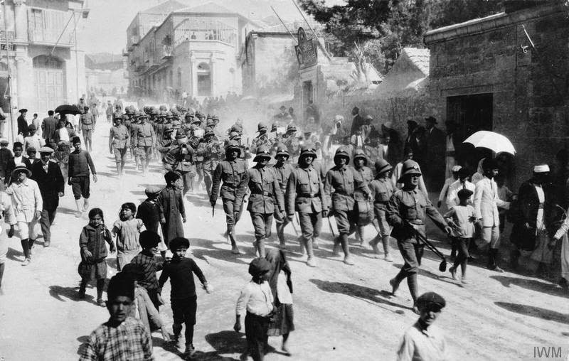 German troops marching in Jerusalem on Good Friday, April 6, 1917. The building on the left is the Fast Hotel. (Imperial War Museum, UK)